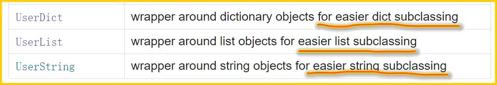 官方 Python 当然也意识到了这么问题,不过它并没有改变内置类型的特性,而是提供出了新的方案:UserString、UserList、UserDict……