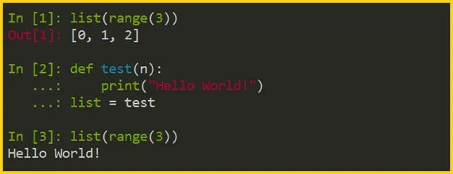 在这个例子中,我们将自定义的 test 赋值给了 list,程序并没有报错。这个例子甚至还可以改成直接定义新的同名函数,即"def list(): …"。