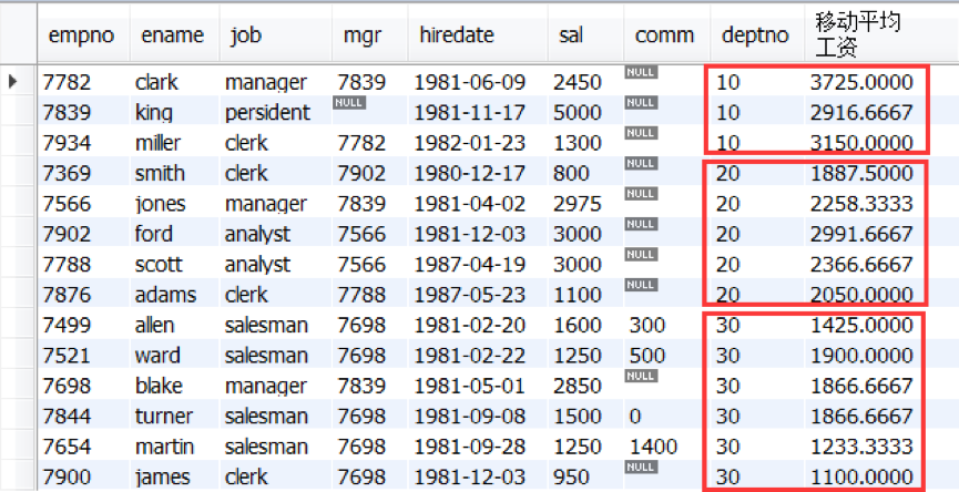 over(partition by deptno order by hiredate rows between 1 preceding and 1 following) as 移动平均工资