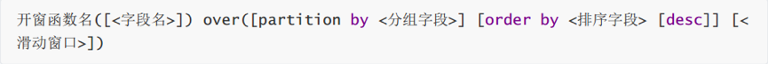开窗函数的一个概念是当前行,当前行属于某个窗口,窗口由over关键字来指定函数执行的窗口范围。如果后面括号中什么都不写,则意味着窗口包含满足where条件的所有行,开窗函数基于所有行进行计算;如果不为空,则有三个参数来设置窗口: