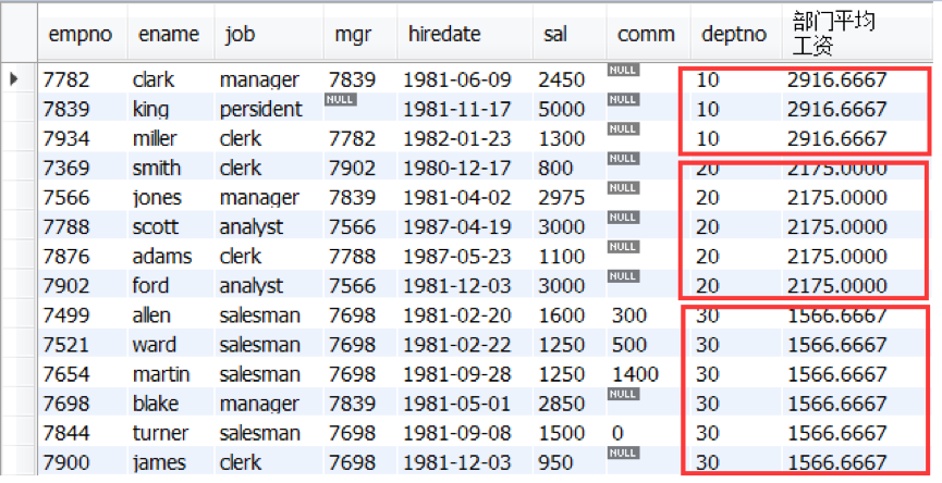 select *,avg(sal) over(partition by deptno) 部门平均工资 from emp;