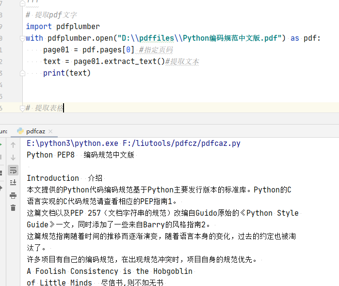 # 提取pdf文字 import pdfplumber with pdfplumber.open("D:\\pdffiles\\Python编码规范中文版.pdf") as pdf: page01 = pdf.pages[0] #指定页码 text = page01.extract_text()#提取文本 print(text)