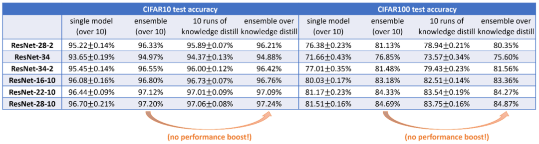 在图3中,NTK 模型的集成的准确率为 70.54% ,而直接训练10个模型的平均值准确率为72.86%。主要原因在于,神经网络是使用分层特征学习,尽管每个模型𝐹𝑖有不同的初始化,但在每一层它们都拥有相同的特征集合。因此,与单个模型相比,多个模型的平均模型,并没有增加其特征集合的大小。在随机特征映射中,每个 𝐹𝑖 都使用了一组完全不同的规定特征。因此,无论是使用集成的方式,还是直接求平均的方式,都能够带来一些性能优势,但由于特征的稀缺性,在蒸馏后,性能必然会有一定下降。除了随机特征的集成外,还有人推测认为,由于神经网络的高度复杂性,每个单独的模型 𝐹𝑖 可能学习到一个函数 𝐹𝑖 (𝑥)=𝑦+ξ𝑖,ξ𝑖 是某种噪声,这种噪声取决于训练过程中使用的随机性。经典的统计学认为,如果所有的ξ𝑖是大致独立的,那么求取他们的平均值能够大大减少噪音量。“集成能够减少方差”真的是集成能提高提高性能的原因吗?证据表明,在深度学习的背景下,这种减少方差来提升性能的假设是值得怀疑的:集成超过100个单个模型通常,与集成10个单个模型基本没有差别。因此,100 ξ𝑖 的平均值与10 ξ𝑖 的平均值相比,方差不再减小,表明 ξ𝑖 可能是不独立的,而且有可能存在偏差,因此均值不为零。在ξ𝑖 不独立的情况下,很难讨论求得这些 ξ𝑖 的平均值能够减少多少偏差。2. 即使理想情况下,我们认为ξ𝑖 是相互独立的,那么这就表明ξ𝑖 是有偏或异号的。ξ 是一个固定误差,ξ𝑖 则指每个模型的独立误差。于是在集成之后,期望的网络输出将接近 y + ξ,这会有一个固定的偏差 ξ。在这种情况下,为什么知识蒸馏会有效呢?那么,为什么这个带有偏差 ξ (也被称为隐藏知识)的输出会优于原来的训练呢?在图4中,我们可以看到神经网络的集成学习并不总是能够提高测试的准确性,至少在输入类似高斯分布的情况下是这样。换句话说,在这些网络中,求平均值不会带来任何准确性的增益。综上来看,我们需要更深入地理解深度学习中的集成,而不只是认为“集成能够减少方差”这么简单。图4: 当输入类似高斯分布时,实验表明集成并不能提高测试的准确性。