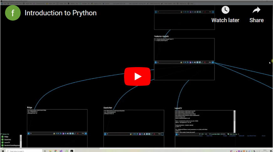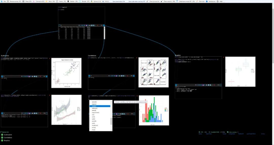 该项目的优点都与易于集成的 Python 和 R 编程环境有关,包括输入输出流管理的无代码功能、数据可视化、在项目流中不同的位置旋出上下文控制台、混合数据框架检查等等。