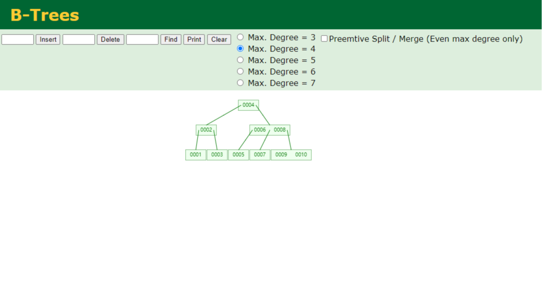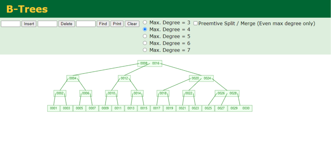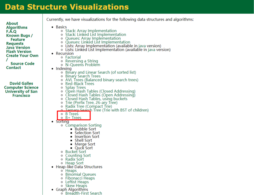 先来看一下 BTree 的数据结构是怎么样的,这里咔咔给提供一个网站地址,可以看到关于数据结构的一些实现过程: