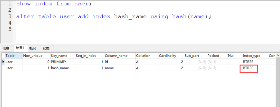 会发现 name 的索引类型还是为 Btree,在 innodb 上创建哈希索引,被称之为伪哈希索引,和真正的哈希索引不是一回事的,这点一定要明白。