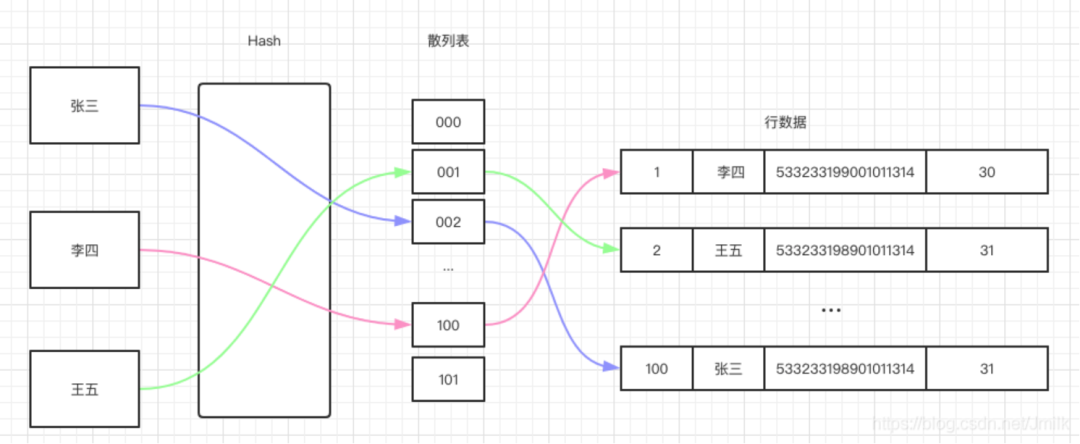 哈希索引就是基于哈希表实现的,假设对 name 建立了哈希索引,则查找过程如下图所示,哈希表是根据键值对进行访问的数据结构,它让检索的数据经过哈希函数映射到散列表的对应位置,查找效率非常高。