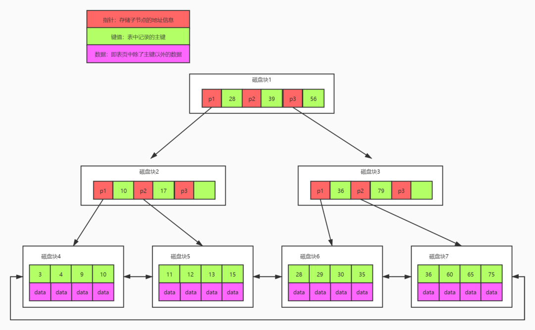 B+Tree 每个叶子节点都有指向下一个叶子节点的链接。这样的好处在于,我们可以从任意一个叶子节点开始遍历,获取接下来所有的数据。