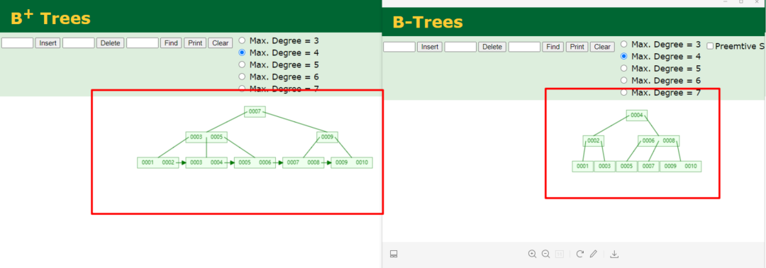 依然如初看一下 B+Tree 的数据结构。为了方便对比,将 BTree 和 B+Tree 的数据结构放到了一起。那么可以看到在 B+Tree 中叶子节点是存放了全量的数据,而非叶子节点只存储了 key 值。