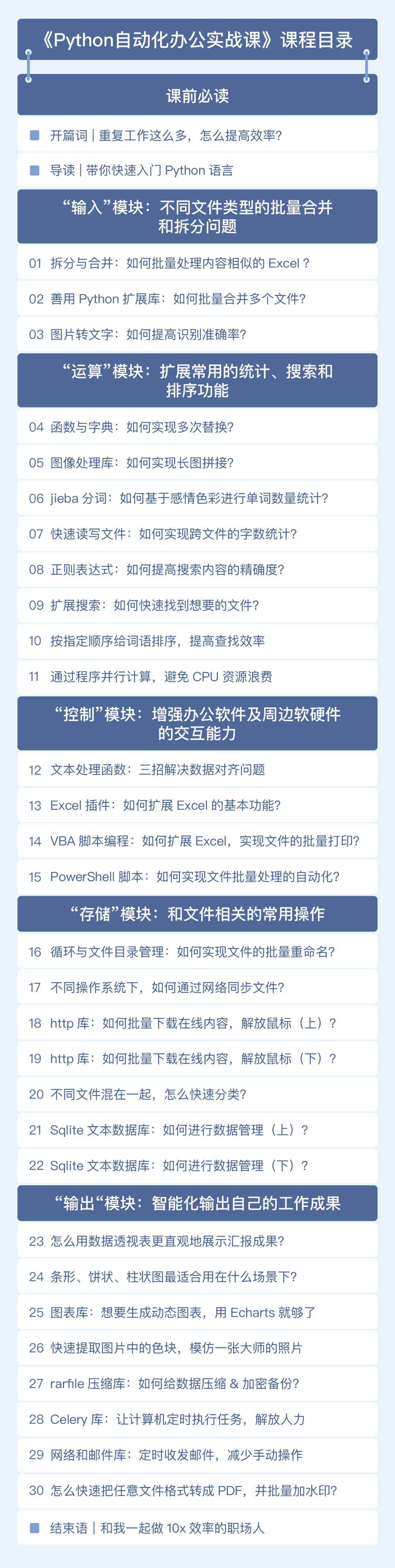 不同于市面上其他的 Python 自动化办公课程,这个专栏并非只给你几个固定工作场景、固定工具包,而是让你通过理解计算机的交互过程,把常见的 30 个机械、重复的工作场景,按照任务类型划分为 5 大模块:解决不同文件类型的批量合并和拆分问题。通过 Python,解决 Excel、Word 中需要重复执行的合并、拆分等需要手工操作的工作。扩展常用的统计、搜索和排序功能。包括统计和排序的字数统计、感情色彩词汇的统计、按指定顺序给词汇排序,在海量文件中实现精确搜索等。通过插件的方式增强办公软件以及周边软件、硬件的交互能力。借助插件、VBA 脚本、PowerShell 等外部设备扩展办公软件的基本功能,帮助你解决常见的批量打印、数据对齐和文件批量处理等问题。这个模块会把 Python 和网络功能相结合,实现文件批量改名、批量下载、同步网络、快速分类、数据管理等操作的自动化,让你摆脱手工重复操作的苦恼。直观、智能化输出自己的工作成果。比如将你要交付的数据,通过 Python 一键转为图形,也可以通过 Python 将 Excel、自动发邮件、压缩文件、凌晨定时执行指定任务和日常办公进行整合。同时,还会教你对文件和数据进行加密、加水印和备份。老规矩,福利时间到