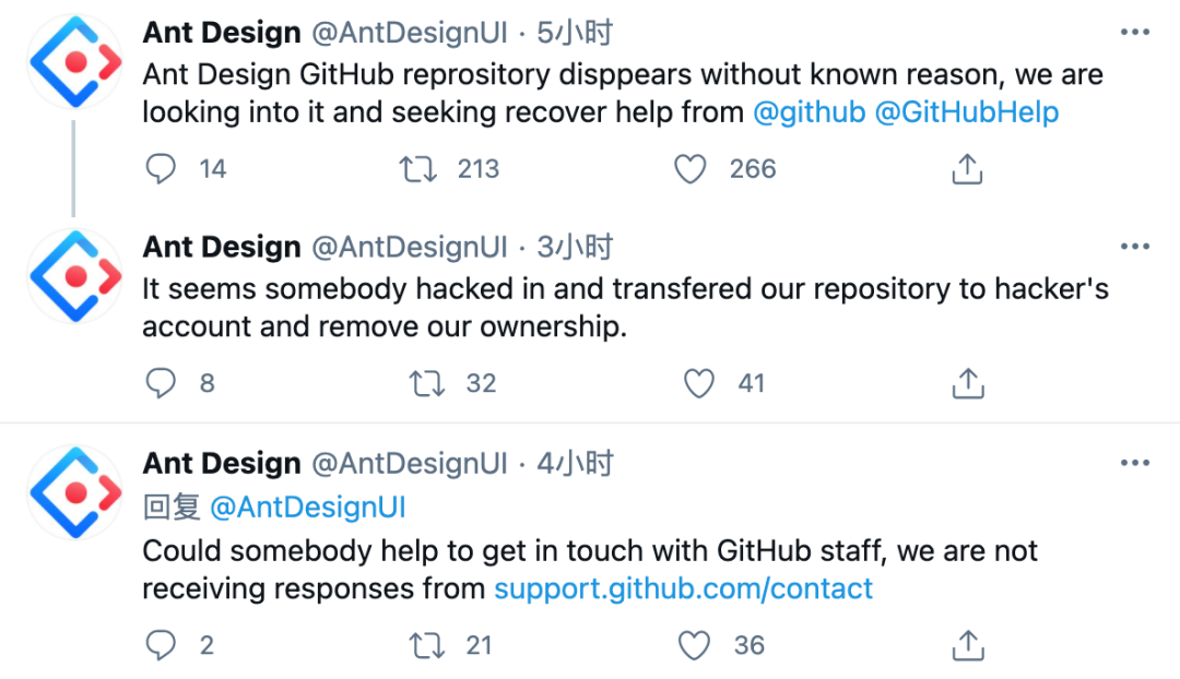 Ant Design GitHub代码库突然无故消失,我们正在调查此事,并寻求GitHub和GitHub支持团队的帮助以尽快恢复。