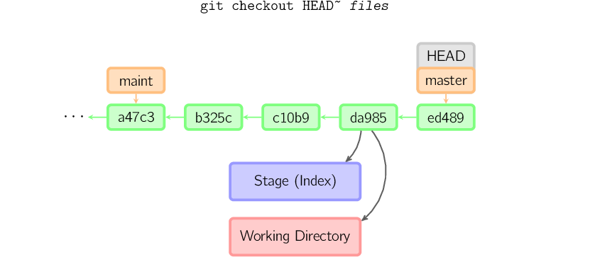 git checkout – files把文件从暂存区域复制到工作目录,用来丢弃本地修改。