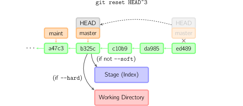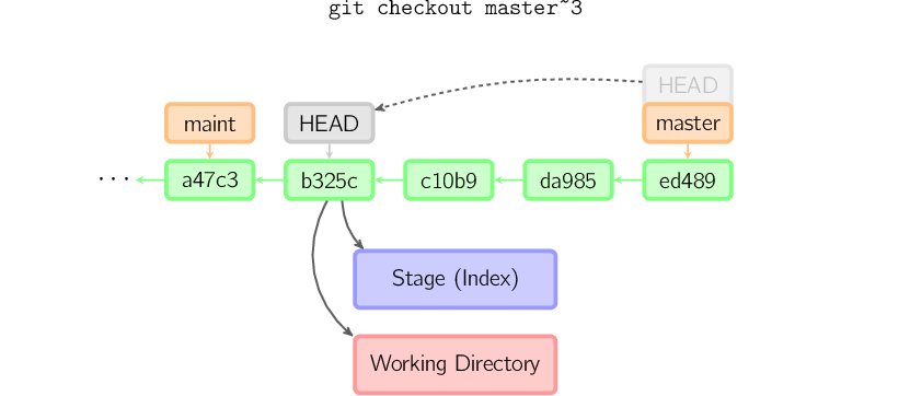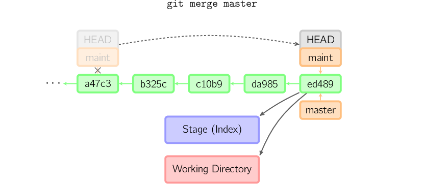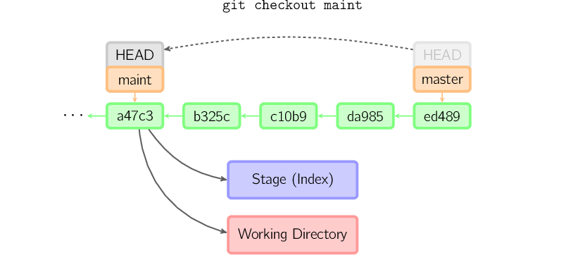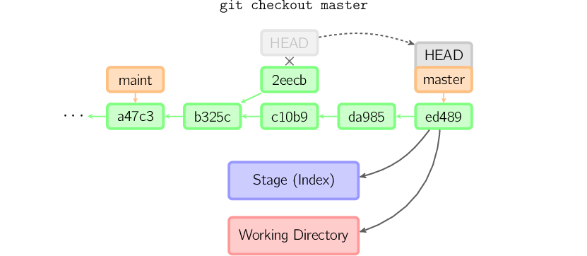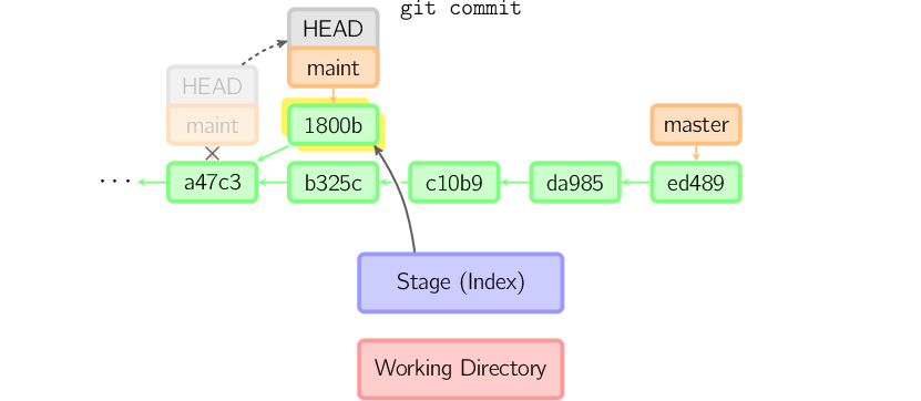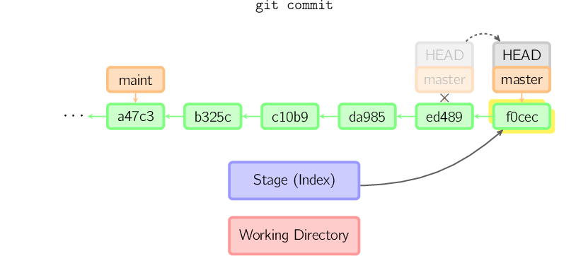 绿色的5位字符表示提交的ID,分别指向父节点。分支用橘色显示,分别指向特定的提交。当前分支由附在其上的HEAD标识。这张图片里显示最后5次提交,ed489是最新提交。master分支指向此次提交,另一个maint分支指向祖父提交节点。有许多种方法查看两次提交之间的变动,下面是一些示例。提交时,Git用暂存区域的文件创建一个新的提交,并把此时的节点设为父节点。然后把当前分支指向新的提交节点。下图中,当前分支是master。在运行命令之前,master指向ed489,提交后,master指向新的节点f0cec并以ed489作为父节点。即便当前分支是某次提交的祖父节点,git会同样操作。下图中,在master分支的祖父节点maint分支进行一次提交,生成了1800b。这样,maint分支就不再是master分支的祖父节点。此时,合并[1](或者衍合[2])是必须的。如果想更改一次提交,使用git commit –amend。Git会使用与当前提交相同的父节点进行一次新提交,旧的提交会被取消。Checkout命令用于从历史提交(或者暂存区域)中拷贝文件到工作目录,也可用于切换分支。当给定某个文件名(或者打开-p选项,或者文件名和-p选项同时打开)时,Git会从指定的提交中拷贝文件到暂存区域和工作目录。比如,git checkout HEAD~ foo.c会将提交节点HEAD~(即当前提交节点的父节点)中的foo.c复制到工作目录并且加到暂存区域中。(如果命令中没有指定提交节点,则会从暂存区域中拷贝内容。)注意当前分支不会发生变化。当不指定文件名,而是给出一个(本地)分支时,那么HEAD标识会移动到那个分支(也就是说,我们“切换”到那个分支了),然后暂存区域和工作目录中的内容会和HEAD对应的提交节点一致。新提交节点(下图中的a47c3)中的所有文件都会被复制(到暂存区域和工作目录中);只存在于老的提交节点(ed489)中的文件会被删除;不属于上述两者的文件会被忽略,不受影响。如果既没有指定文件名,也没有指定分支名,而是一个标签、远程分支、SHA-1值或者是像master~3类似的东西,就得到一个匿名分支,称作detached HEAD(被分离的HEAD标识)。这样可以很方便地在历史版本之间互相切换。比如说你想要编译1.6.6.1版本的Git,你可以运行git checkout v1.6.6.1(这是一个标签,而非分支名),编译,安装,然后切换回另一个分支,比如说git checkout master。然而,当提交操作涉及到“分离的HEAD”时,其行为会略有不同,详情见在下面。当HEAD处于分离状态(不依附于任一分支)时,提交操作可以正常进行,但是不会更新任何已命名的分支。(你可以认为这是在更新一个匿名分支。)一旦此后你切换到别的分支,比如说master,那么这个提交节点(可能)再也不会被引用到,然后就会被丢弃掉了。注意这个命令之后就不会有东西引用2eecb。但是,如果你想保存这个状态,可以用命令git checkout -b name来创建一个新的分支。Reset命令把当前分支指向另一个位置,并且有选择的变动工作目录和索引。也用来在从历史仓库中复制文件到索引,而不动工作目录。如果不给选项,那么当前分支指向到那个提交。如果用–hard选项,那么工作目录也更新,如果用–soft选项,那么都不变。