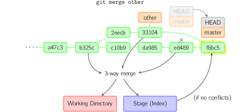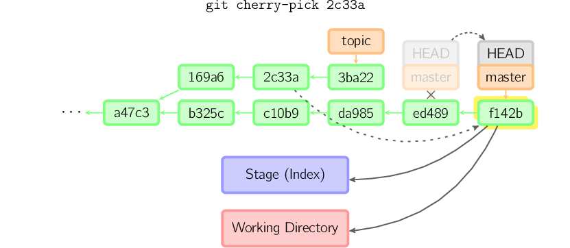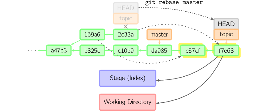 如果没有给出提交点的版本号,那么默认用HEAD。这样,分支指向不变,但是索引会回滚到最后一次提交,如果用–hard选项,工作目录也同样。如果给了文件名(或者-p选项),那么工作效果和带文件名的checkout差不多,除了索引被更新。Merge命令把不同分支合并起来。合并前,索引必须和当前提交相同。如果另一个分支是当前提交的祖父节点,那么合并命令将什么也不做。另一种情况是如果当前提交是另一个分支的祖父节点,就导致fast-forward合并。指向只是简单的移动,并生成一个新的提交。否则就是一次真正的合并。默认把当前提交(ed489 如下所示)和另一个提交(33104)以及他们的共同祖父节点(b325c)进行一次三方合并[4]。结果是先保存当前目录和索引,然后和父节点33104一起做一次新提交。cherry-pick命令“复制”一个提交节点并在当前分支做一次完全一样的新提交。衍合是合并命令的另一种选择。合并把两个父分支合并进行一次提交,提交历史不是线性的。衍合在当前分支上重演另一个分支的历史,提交历史是线性的。本质上,这是线性化的自动的 cherry-pick。上面的命令都在topic分支中进行,而不是master分支,在master分支上重演,并且把分支指向新的节点。注意旧提交没有被引用,将被回收。要限制回滚范围,使用–onto选项。下面的命令在master分支上重演当前分支从169a6以来的最近几个提交,即2c33a。同样有git rebase –interactive让你更方便的完成一些复杂操作,比如丢弃、重排、修改、合并提交。没有图片体现这些,细节看这里:git-rebase(1)[5]。文件内容并没有真正存储在索引(.git/index)或者提交对象中,而是以blob的形式分别存储在数据库中(.git/objects),并用SHA-1值来校验。索引文件用识别码列出相关的blob文件以及别的数据。对于提交来说,以树(tree)的形式存储,同样用对于的哈希值识别。树对应着工作目录中的文件夹,树中包含的 树或者blob对象对应着相应的子目录和文件。每次提交都存储下它的上一级树的识别码。如果用detached HEAD提交,那么最后一次提交会被the reflog for HEAD引用。但是过一段时间就失效,最终被回收,与git commit –amend或者git rebase很像。
