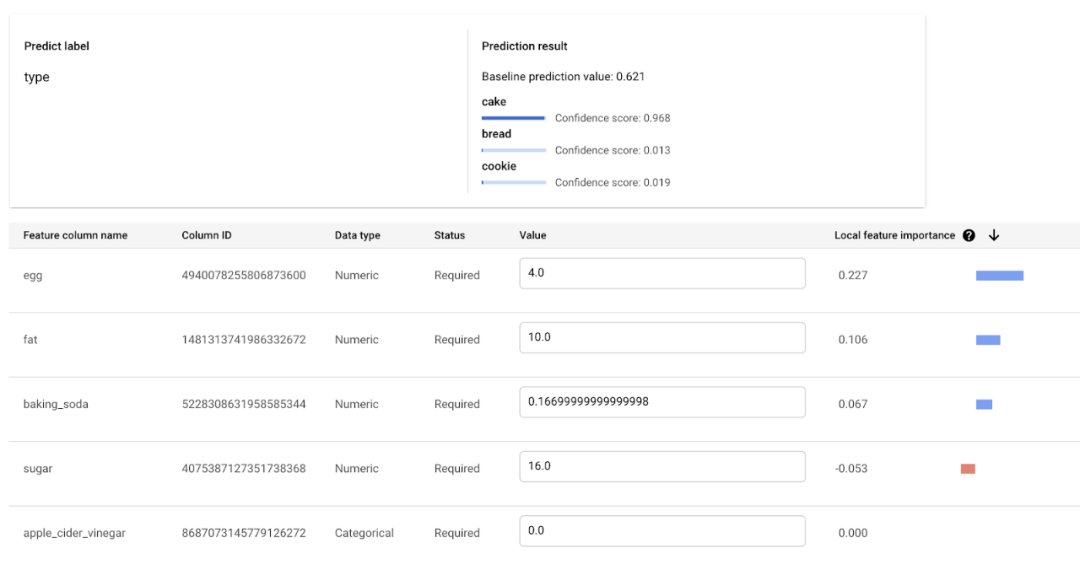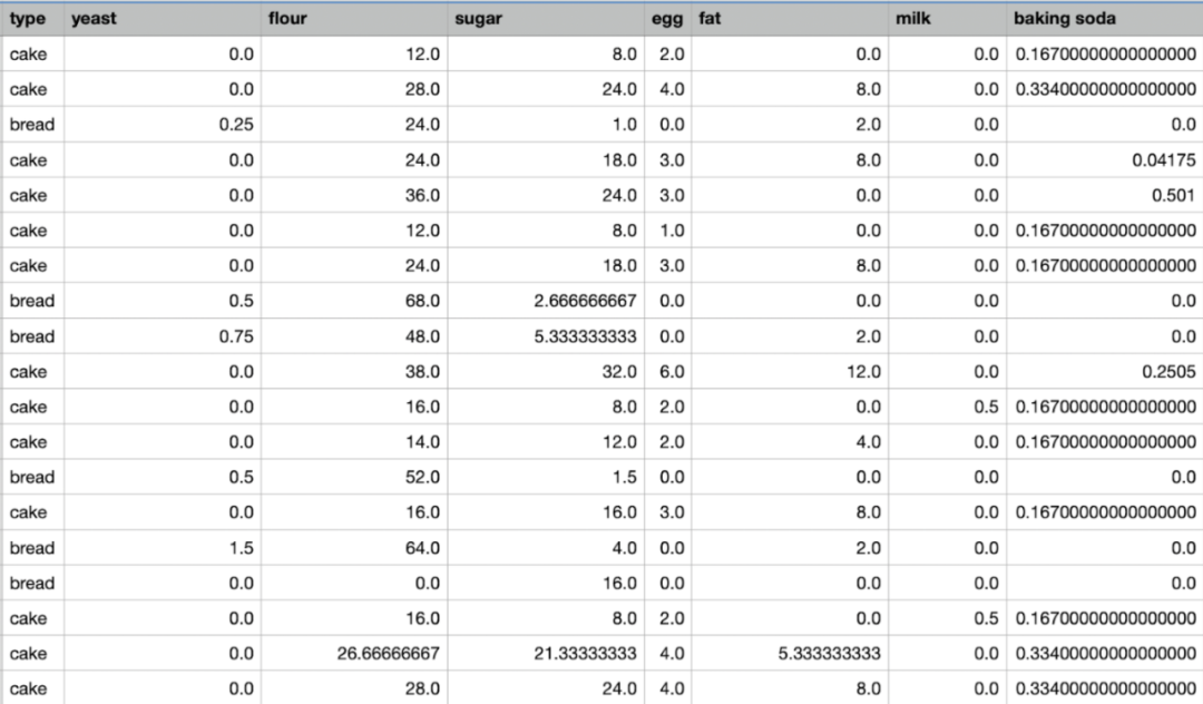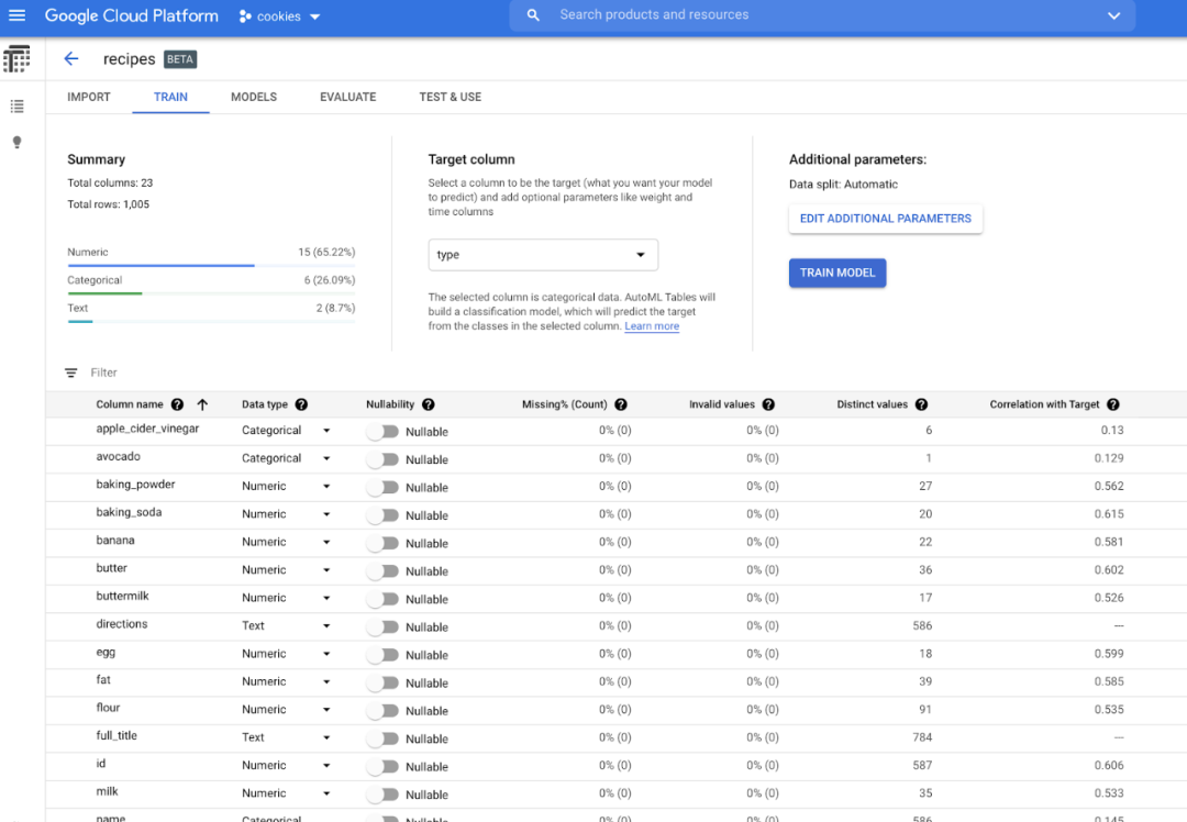 首先,Sara 和她的同事从网上搜集了 600 多个配方构成配方数据集,包括面包、蛋糕和饼干。然后,将其中常用的核心原料提取出来,共 16 种,包括面粉、酵母、牛奶、水、盐、蛋等。然后对这些配方中,各种原料的度量单位进行统一,比如,有的以“杯”为单位,有的以“勺”为单位,作者将其全部转换为“盎司”(1 盎司 ≈28.35 克)。他们使用 Google 的 AutoML Tables,构建了一个分类模型。创建新的表格模型后,就可以直接从 csv、Google 表格或 BigQuery 数据库导入数据。数据导入后,可以在“训练”标签中看到它们:用这些数据对模型进行训练之后,模型就掌握了每种烘焙品所对应的配方特点,从而能够进行更准确的预测。
