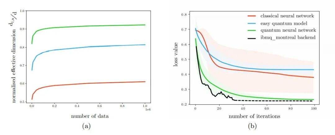 Abbas 等人利用模型的维数来比较不同神经网络的能力。研究结果表明,量子神经网络结合了良好的特征图(对数据进行编码),使其有效维数高于经典神经网络。此外,与经典神经网络不同的是,量子神经网络提供了更好的 Fisher 信息矩阵,并且特征值更均匀,不为零。这种量子神经网络在 IBM 的 27 位量子比特机器上的 Iris 数据集 上,于经典神经网络相比,训练和收敛速度更快。