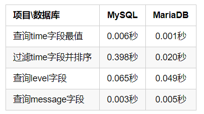 ADD FULLTEXT INDEX `message` (`message`);MariaDB 用时 2 分 47 秒,MySQL 用时 3 分 48 秒。再用上面的测试项目进行测试,结果如下表所示: