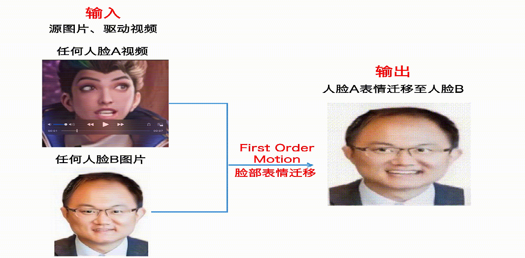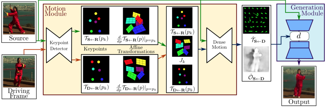 这个能力依托于 First Order Motion 算法,它不仅能轻松实现「蚂蚁呀嘿」换脸视频,还支持你自己录制面部动作,生成任何题材的换脸视频,甚至开发属于自己的 App 或者小程序,走上发家致富之路~光说不练假把式,接下来贴心的小G就给大家介绍下这个核心技术,并真正手把手教你三步实现「蚂蚁呀嘿」~首先,不得不提的是「蚂蚁呀嘿」的视频换脸所应用的核心 —— 动作迁移算法 First Order Motion。它的功能就是将人物 A 的脸部动作搬移到人物 B 身上,让人物 B 的脸完美演绎人物 A 的表情。First Order Motion 算法的结构图如下:简单的说,First Order Motion 能够通过自监督的方式学习到图像中的关键点。不需要先验地知道目标的一些信息,比如骨架等就可以实现动作迁移。
