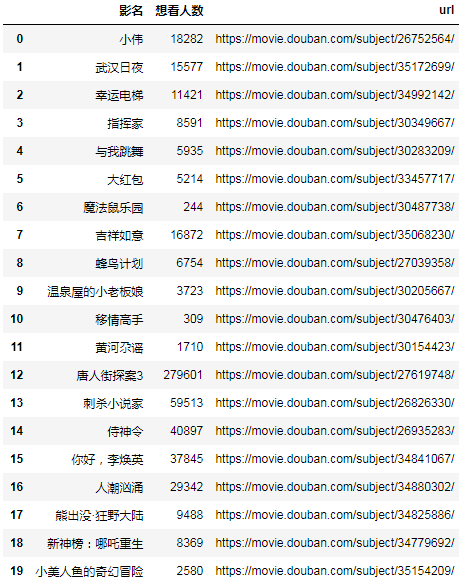 html = etree.HTML(r.text) all_movies = html.xpath("//div[@id='showing-soon']/div" ) result = []for e in all_movies: # imgurl, = e.xpath(".//img/@src") name, = e.xpath(".//div[@class='intro']/h3/a/text()" ) url, = e.xpath(".//div[@class='intro']/h3/a/@href" ) # date, movie_type, pos = e.xpath(".//div[@class='intro']/ul/li[@class='dt']/text()") like_num, = e.xpath( ".//div[@class='intro']/ul/li[@class='dt last']/span/text()" ) result.append((name, int(like_num[:like_num.find("人" )]), url)) main_df = pd.DataFrame(result, columns=["影名" , "想看人数" , "url" ]) main_df