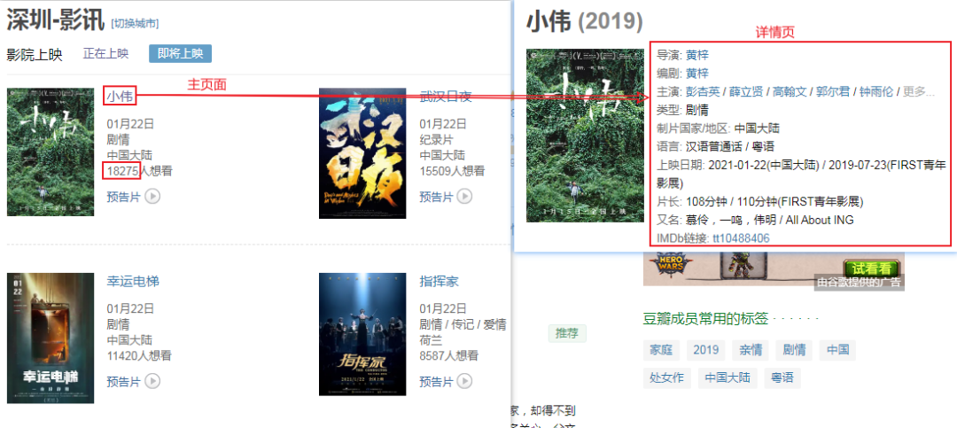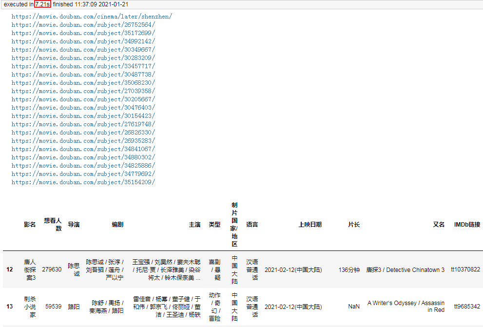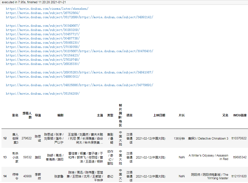 import requestsfrom lxml import etreeimport pandas as pdimport re main_url = "https://movie.douban.com/cinema/later/shenzhen/" headers = { "Accept-Encoding" : "Gzip" , "User-Agent" : "Mozilla/5.0 (Windows NT 6.1; WOW64) AppleWebKit/537.36 (KHTML, like Gecko) Chrome/78.0.3904.108 Safari/537.36" } r = requests.get(main_url, headers=headers) r