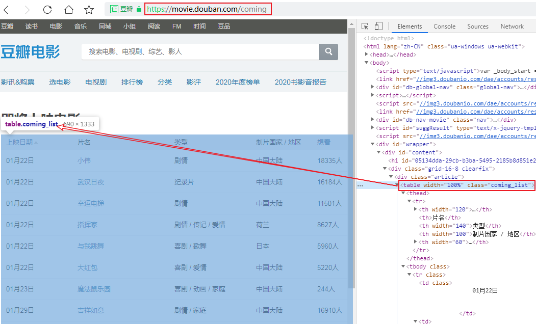 查看全部即将上映的影片 ] (https://movie.douban.com/coming )的按钮,点进去能够看到一张完整近期上映电影的列表,发现这个列表是个table标签的数据: