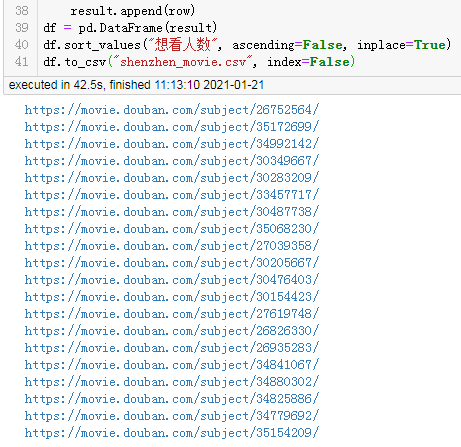 单线程爬虫 import requestsfrom lxml import etreeimport pandas as pdimport re main_url = "https://movie.douban.com/cinema/later/shenzhen/" headers = { "Accept-Encoding" : "Gzip" , "User-Agent" : "Mozilla/5.0 (Windows NT 6.1; WOW64) AppleWebKit/537.36 (KHTML, like Gecko) Chrome/78.0.3904.108 Safari/537.36" } r = requests.get(main_url, headers=headers) html = etree.HTML(r.text) all_movies = html.xpath("//div[@id='showing-soon']/div" ) result = []for e in all_movies: imgurl, = e.xpath(".//img/@src" ) name, = e.xpath(".//div[@class='intro']/h3/a/text()" ) url, = e.xpath(".//div[@class='intro']/h3/a/@href" ) print(url)# date, movie_type, pos = e.xpath(".//div[@class='intro']/ul/li[@class='dt']/text()") like_num, = e.xpath( ".//div[@class='intro']/ul/li[@class='dt last']/span/text()" ) r = requests.get(url, headers=headers) html = etree.HTML(r.text) row = {} row["电影名称" ] = name for line in re.split("[\n ]*\n[\n ]*" , "" .join(html.xpath("//div[@id='info']//text()" )).strip()): line = line.strip() arr = line.split(": " , maxsplit=1 ) if len(arr) != 2 : continue k, v = arr row[k] = v row["想看人数" ] = int(like_num[:like_num.find("人" )])# row["url"] = url # row["图片地址"] = imgurl # print(row) result.append(row) df = pd.DataFrame(result) df.sort_values("想看人数" , ascending=False , inplace=True ) df.to_csv("shenzhen_movie.csv" , index=False )