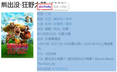 然后再选择一个详情页的url进行测试,我选择了熊出没·狂野大陆这部电影,因为文本数据相对最复杂,也最具备代表性: