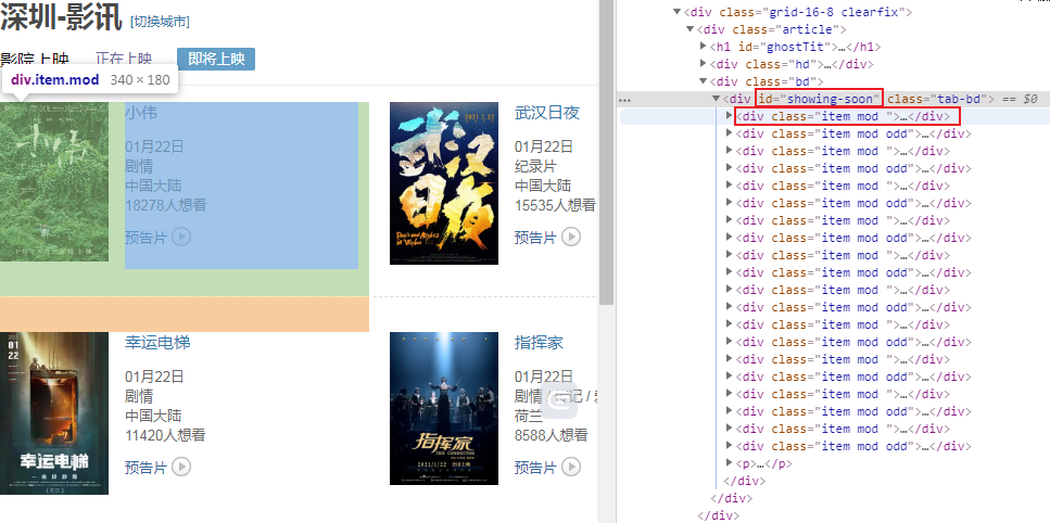 下面的div里面,再分别分析内部的电影名称、url和想看人数所处的位置,于是可以写出如下代码: