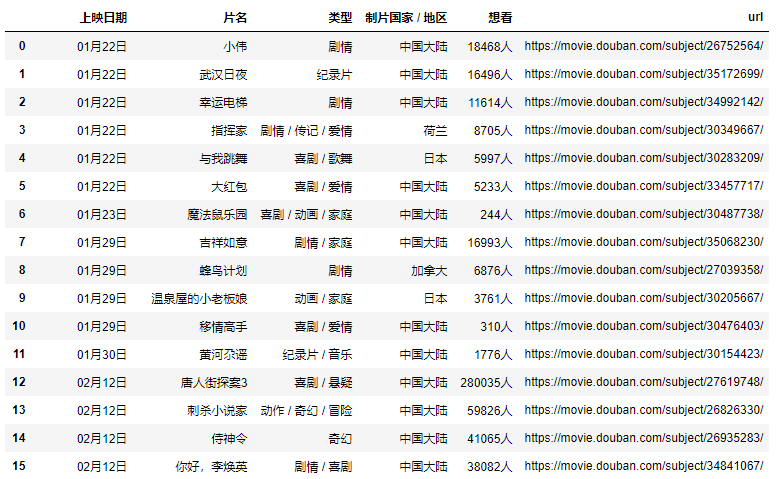import pandas as pdimport requestsfrom lxml import etree headers = { "Accept-Encoding" : "Gzip" , "User-Agent" : "Mozilla/5.0 (Windows NT 6.1; WOW64) AppleWebKit/537.36 (KHTML, like Gecko) Chrome/78.0.3904.108 Safari/537.36" } r = requests.get("https://movie.douban.com/coming" , headers=headers) html = etree.HTML(r.text) table_tag = html.xpath("//table" )[0 ] df, = pd.read_html(etree.tostring(table_tag)) urls = table_tag.xpath(".//td[2]/a/@href" ) df["url" ] = urls df