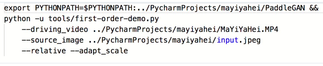 export PYTHONPATH=$PYTHONPATH:../PycharmProjects/mayiyahei/PaddleGAN && python -u tools/first-order-demo.py --driving_video ../PycharmProjects/mayiyahei/MaYiYaHei.MP4 --source_image ../PycharmProjects/mayiyahei/input.jpeg --relative --adapt_scale