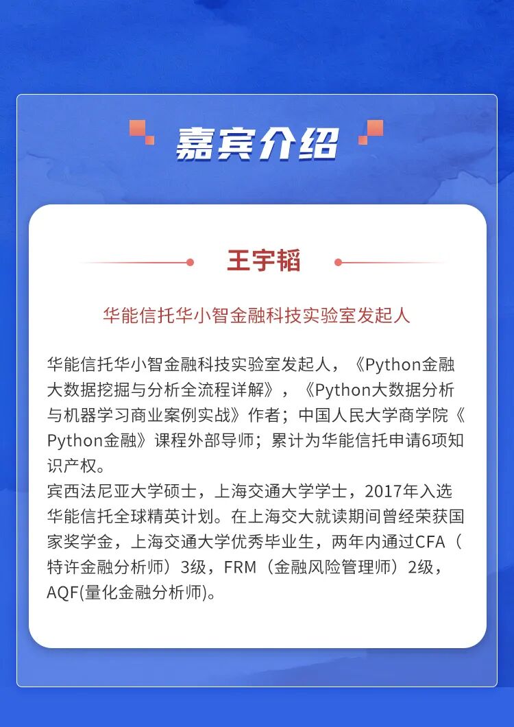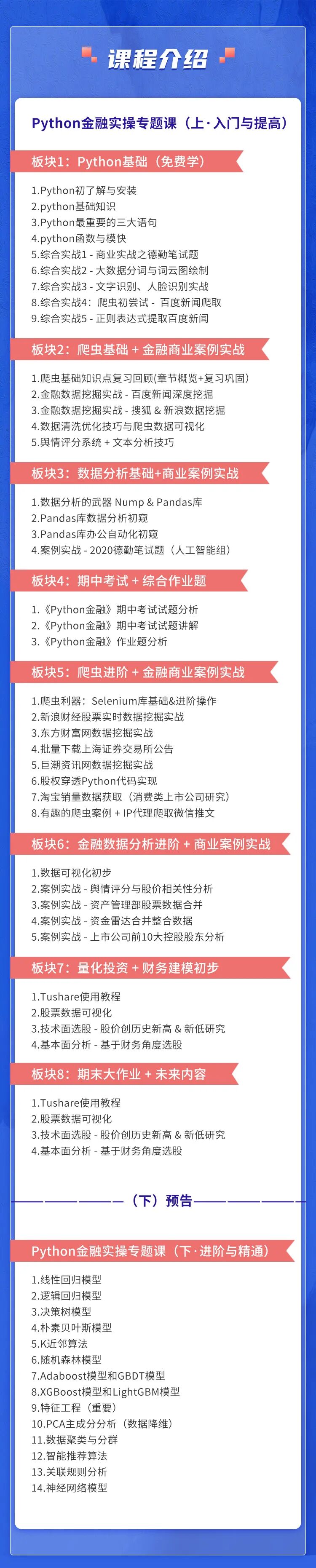 Python快速入门、爬虫基础、数据清洗优化、百度新闻爬取实战、数据分析基础:Numpy与pandas库、股票数据获取初步、人大商学院期中考试讲解、爬虫进阶:Selenium库讲解(包含新浪财经/东方财富网/上海证券交易所/股票实时数据/企业股权穿透)、量化投资 + 财务建模初步:Tushare股票数据获取与分析、人工智能:图片文字识别等、以及来自德勤会计师事务所、华能信托、腾讯微众银行、信托业协会等多个实战案例分析。