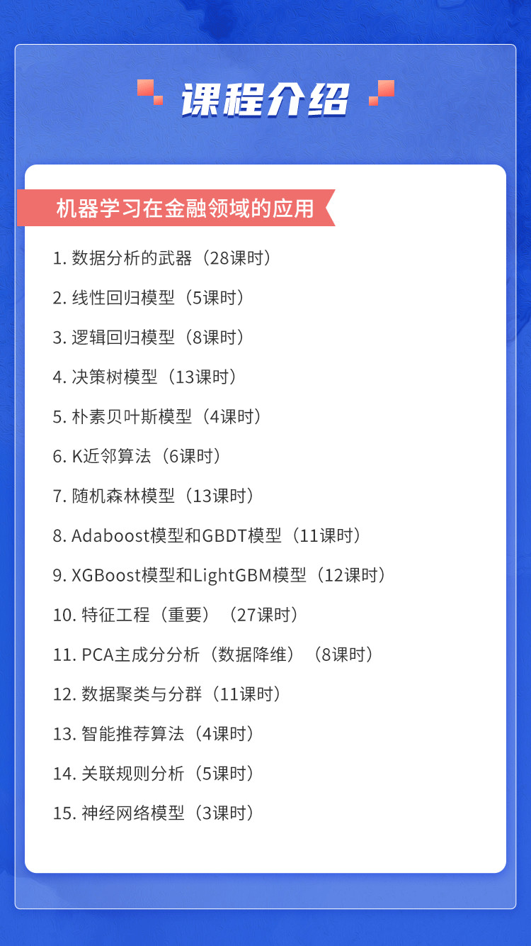 机器学习在金融领域的应用。这一部分我们主要讲解基础的机器学习模型,为之后的集成学习模型做铺垫,包括:线性回归模型、逻辑回归模型、决策树模型、随机森林模型、AdaBoost模型、GBDT模型,以及新兴的集成模型:XGBoost模型与LightGBM模型等。