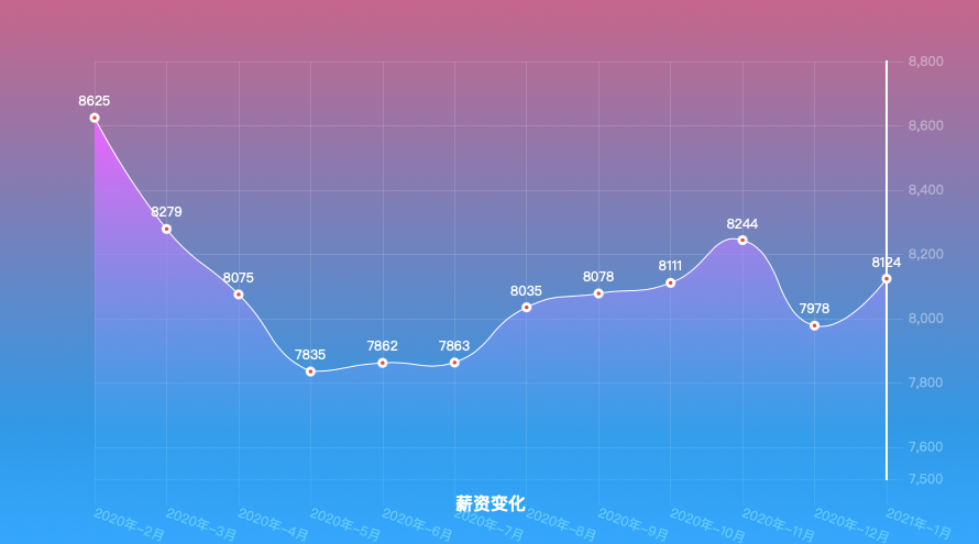 可以看到,去年2月份的薪资水平是最高的,之后一路下滑,再之后就基本趋于稳定了,7-8K这个平均水平。