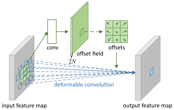 总结一下,meshflow主要的流程为“估计光流-->估计关键点并筛选出关键点的光流-->基于关键点光流得到mesh中每一个格点的motion/轨迹-->进行轨迹平滑并得到平滑后的轨迹/每一个格点的motion-->基于motion得到满足平滑轨迹的视频帧”。总结了meshflow之后,这篇DUT主要进行的工作其实很简单,在meshflow的框架下,将其中所有的模块都deep化:基于Median Filters的轨迹平滑------>可学习的1D卷积除此之外,由于原始的meshflow是基于优化的方法,因此DUT在替换了模块之后依旧保留了原始的约束项,并且可以使用无监督的方式完成训练,效果也好于一票supervised的方法。当年看Deformable Convolutional Networks(DCN)的时候最为惊艳,可能看过的文章少,这种打破固定尺寸和位置的卷积方式,让我感觉非常惊叹,网络怎么能够在没有直接监督的情况下,学习到不同位置的offset的,然后可视化出来,能够使得offset后的位置能够刚好捕捉到不同尺寸的物体,太精彩了!深度学习框架、图像识别、图像生成、模型优化 、自然语言处理我想从深度学习框架、图像识别、图像生成、模型优化 、自然语言处理五个领域评选出一篇最惊艳的论文, 并且对每一篇论文都赋予一个武侠小说里对应的绝顶武功,以此来表达我的膜拜与狂热。深度学习框架