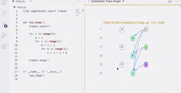 from Cyberbrain import trace# As of now, you can only have one @trace decorator in the whole program. # We may change this in version 2.0, see https://github.com/laike9m/Cyberbrain/discussions/73 @trace # Disable tracing with `@trace(disabled=True)` def foo():Cyberbrain可以保持你的工作流程不变。运行一个程序(从 vscode 或命令行,都可以),一个新的面板将被打开,程序执行情况全部以可视化展示:
