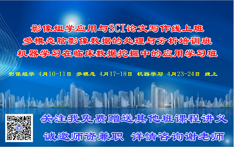 第二天上午 8:30-11:30 | 影像组学SCI写作重点知识点详解与软件实操(2) | 1、常用的降维方法代码实战 2、常用的建模方法(logistic回归、随机森林、支持向量机等)原理讲解 3、常用的建模方法代码实战 4、模型评价、验证及代码实战 5、影像组学模型与临床模型的比较 6、Nomogram与校准曲线的绘制 |