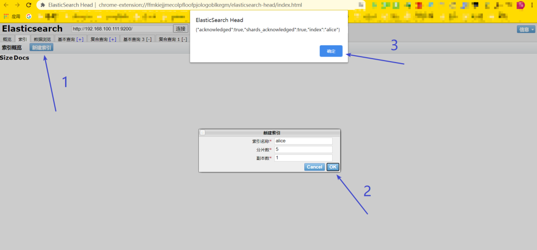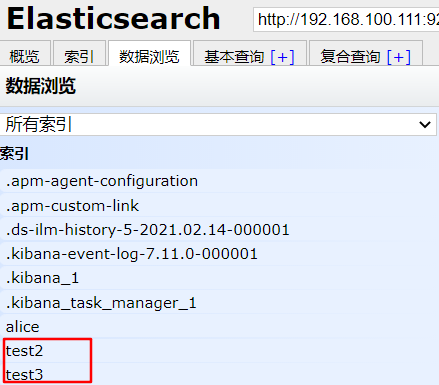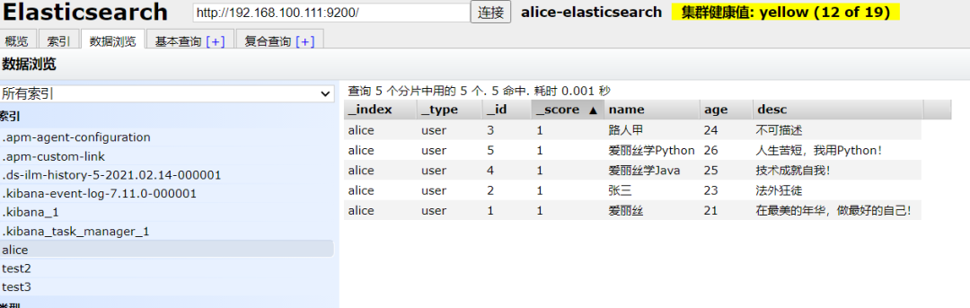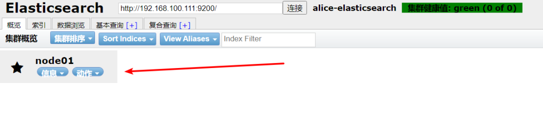 现在还没有索引,我这里就先创建了一个alice索引 然后就可以在概览栏看见分片信息,索引栏看见自己创建的索引,数据浏览栏看到索引里的所有数据!