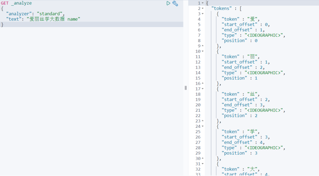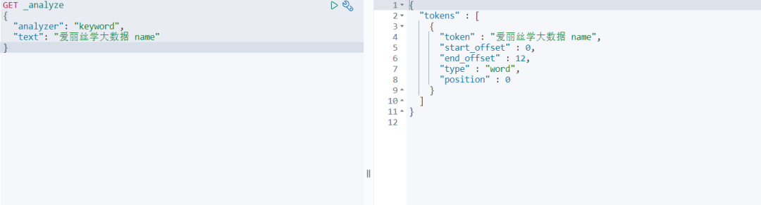 GET _analyze { "analyzer" : "standard" , "text" : "爱丽丝学大数据 name" } 查询结果: 然后我们可以得出结论:keyword 字段类型不会被分析器分析 !
