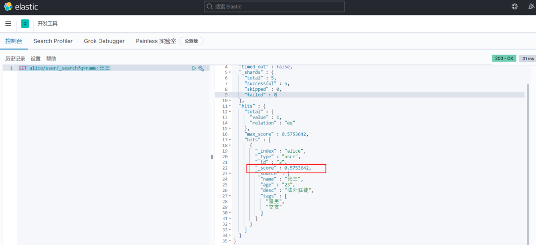 GET alice/user/_search?q=name:张三 我们看一下结果 返回并不是 数据本身,是给我们了一个 hits ,还有 _score得分,就是根据算法算出和查询条件匹配度高的分就越高。