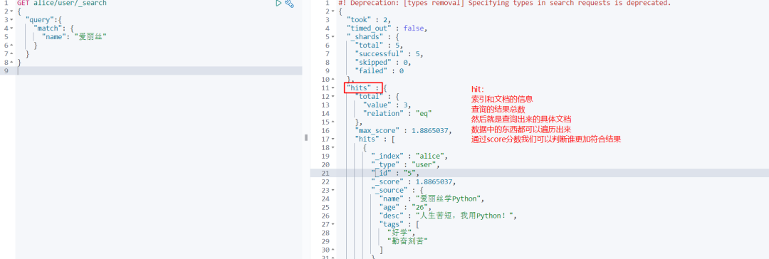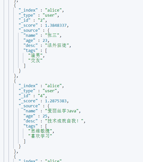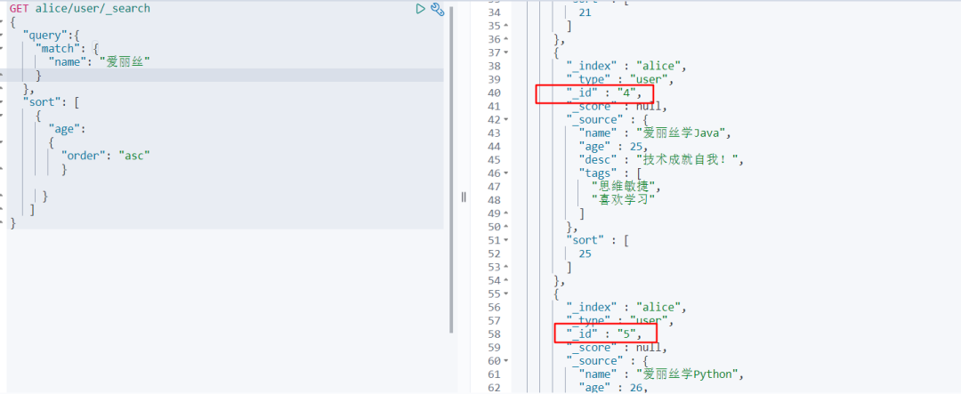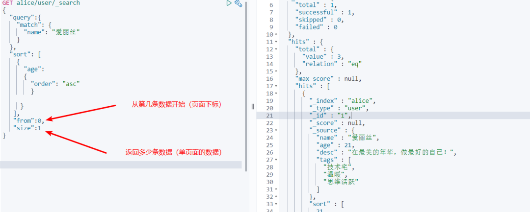 GET alice/user/_search { "query" :{ "match" : { "name" : "爱丽丝" } }, "sort" : [ { "age" : { "order" : "desc" } } ] } 查询返回的结果如下: 同理,如果我们想要正序查询,只需要将desc换成了asc即可。