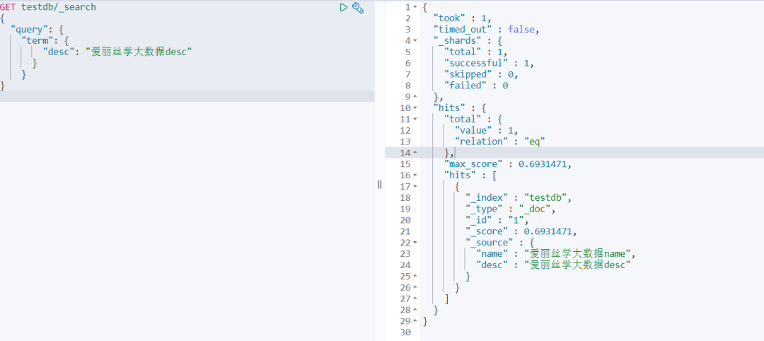 : "爱丽丝学大数据desc" } } } 查询结果,只有1条数据能匹配到