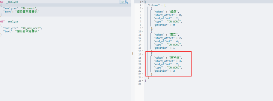 <properties > <comment > IK Analyzer 扩展配置comment > <entry key ="ext_dict" > my.dicentry > <entry key ="ext_stopwords" > entry >properties > 修改完配置重新启动 elasticsearch,再次测试! 此时可以发现,狂神说已经变成了一个词了~