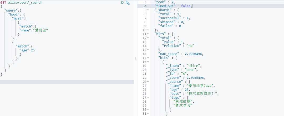 GET alice/user/_search { "query" :{ "bool" : { "must" :[ { "match" :{ "name" :"爱丽丝" } }, { "match" :{ "age" :25 } } ] } } } 查询结果如下should (or)