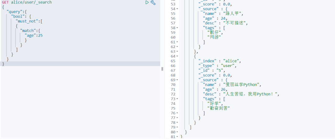 那现在我想要查询年龄不是 25 的 数据,只需要将boolean的属性值换成must_not即可