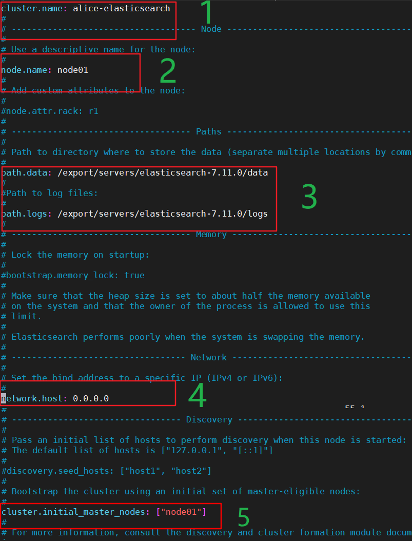 [root@node01 elasticsearch-7.11.0]# vim config/elasticsearch.yml 具体位置如下图所示: