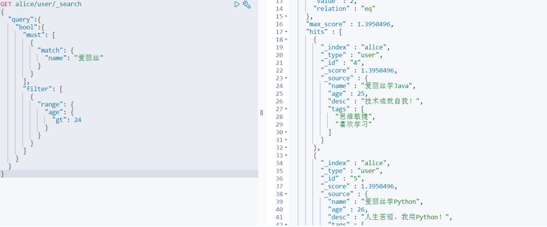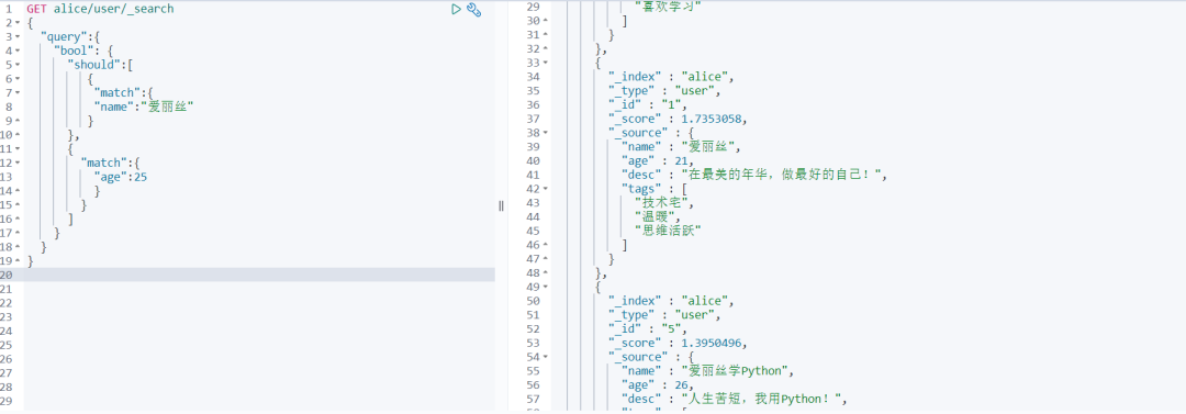 GET alice/user/_search { "query" :{ "bool" : { "should" :[ { "match" :{ "name" :"爱丽丝" } }, { "match" :{ "age" :25 } } ] } } } 查询结果如下