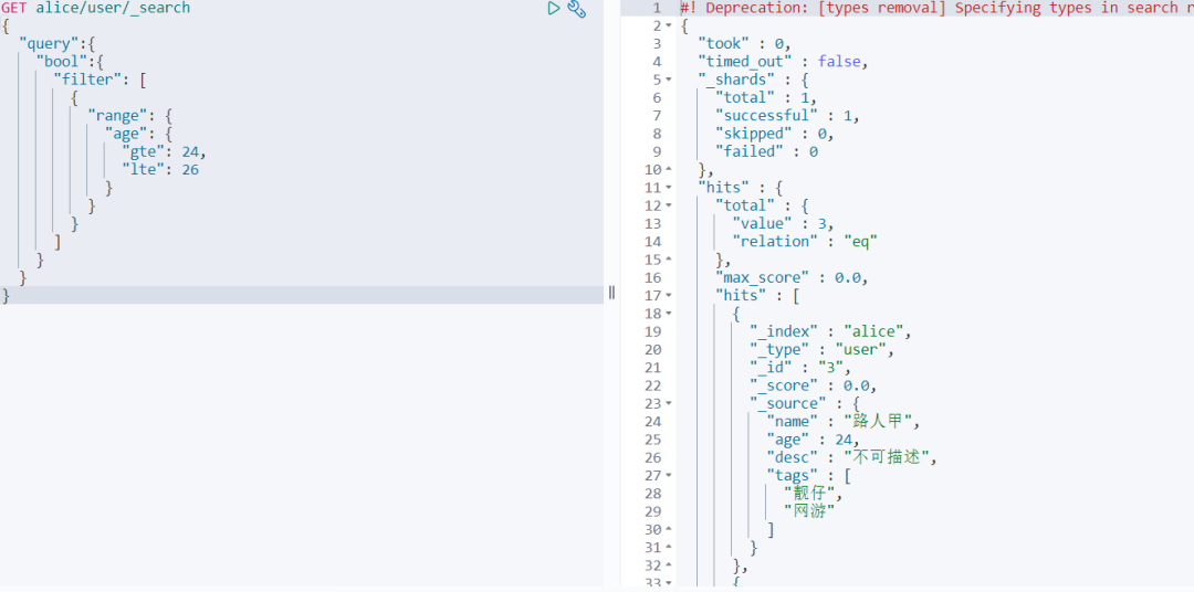 GET alice/user/_search { "query" :{ "bool" :{ "filter" : [ { "range" : { "age" : { "gte" : 24 , "lte" : 26 } } } ] } } } 查询结果: