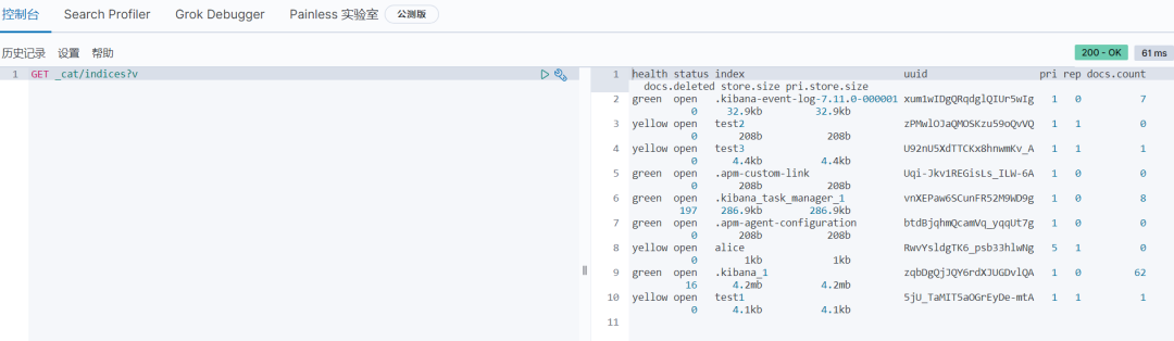 通过命令GET _cat/indices?v,我们可以获取到当前索引的很多信息,返回值包括所有索引的状态健康情况,分片,数据储存大小等等