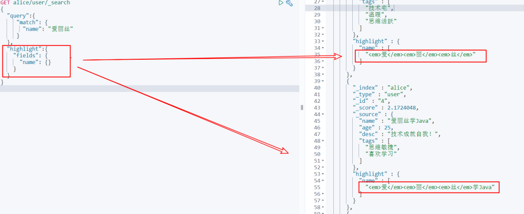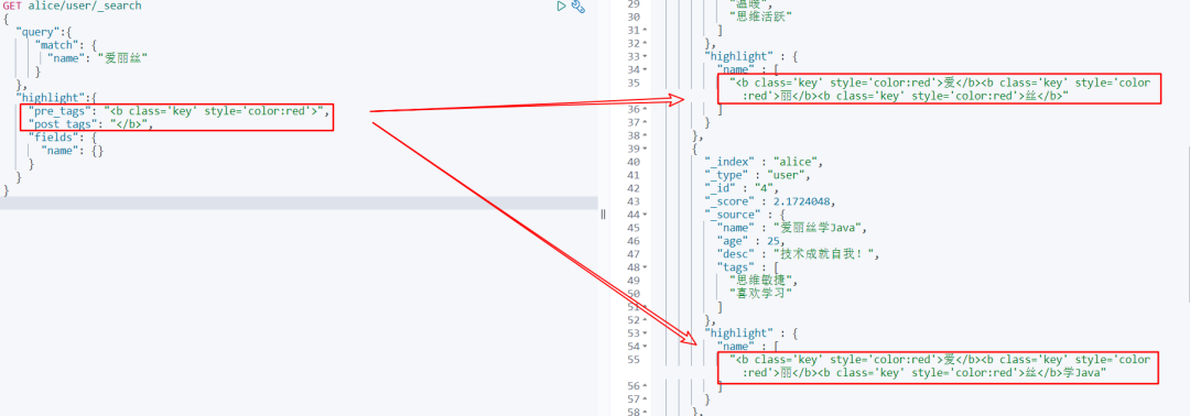 GET alice/user/_search { "query" :{ "match" : { "name" : "爱丽丝" } }, "highlight" :{ "fields" : { "name" : {} } } } 观察返回的结果,我们可以发现搜索相关的结果,被加上了高亮标签 现在效果看到了,那我们有没有办法自定义样式 呢?