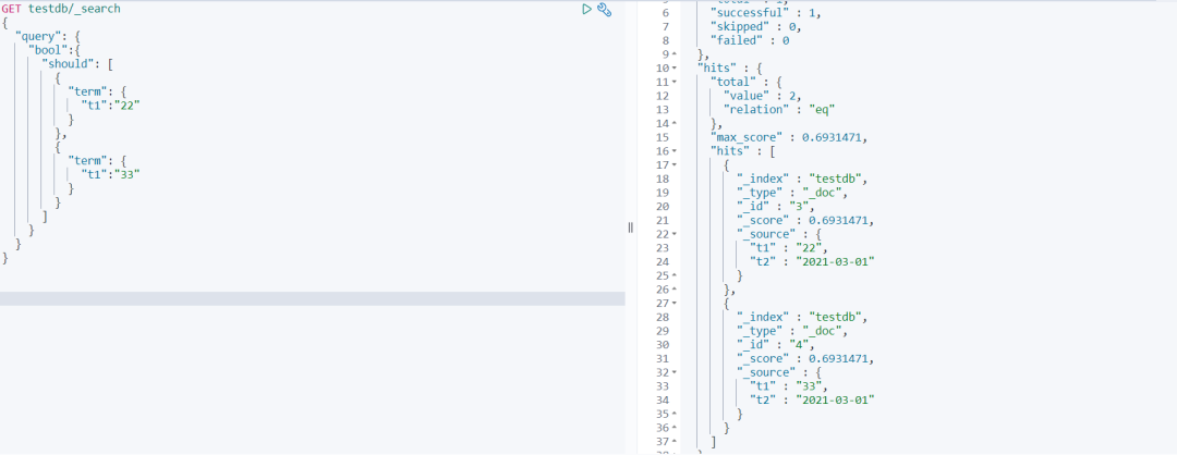 GET testdb/_search { "query" : { "bool" :{ "should" : [ { "term" : { "t1" :"22" } }, { "term" : { "t1" :"33" } } ] } } } 查询结果: 可以发现2条数据也都能查到,证明就算是term精确查询,也能够查询多个值。